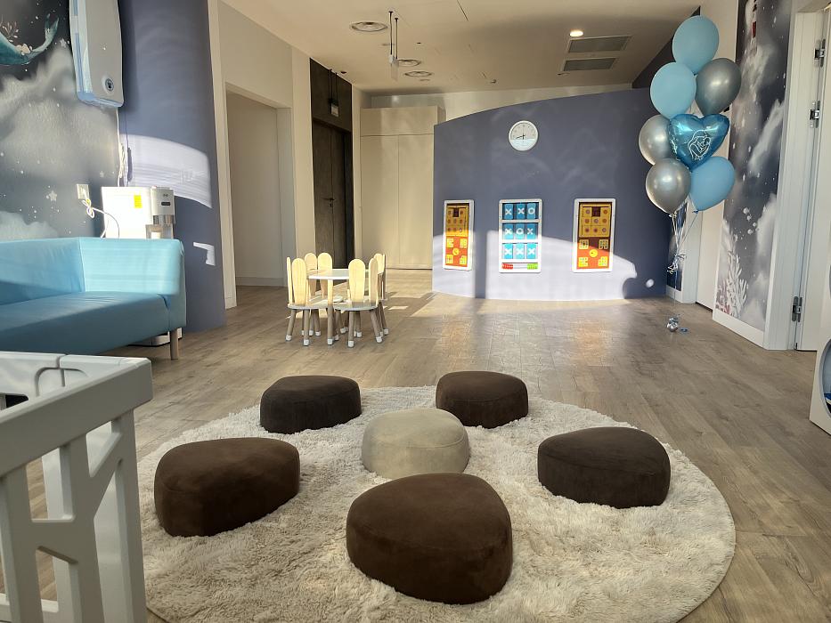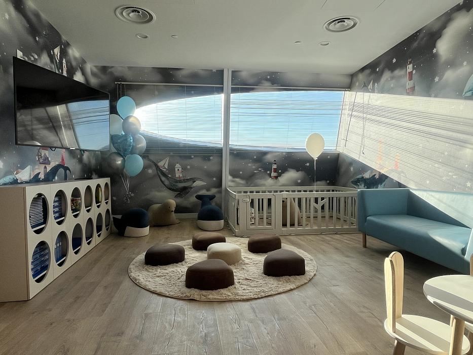 Пространство комнаты создано с учётом потребностей семей с детьми младшего возраста – от 0 до 7 лет. Здесь оборудованы места для кормления и спокойного отдыха, игровая зона, пеленальная комната и прачечная. Интерьер продуман до мелочей: удобная мебель, игрушки и необходимое оборудование позволяют семьям полноценно отдохнуть и ощутить домашний уют перед или после длительного путешествия.